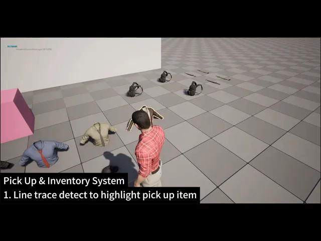 Implemented equip/unequip with AnimMontage + State Machine, supporting idle, crouch, jump, aim transitions.
